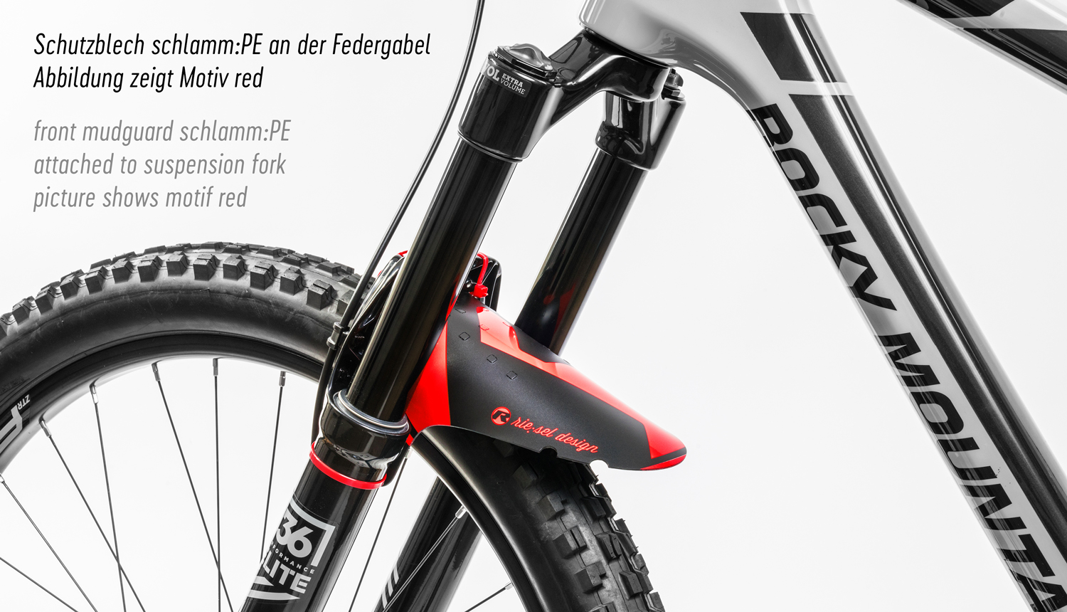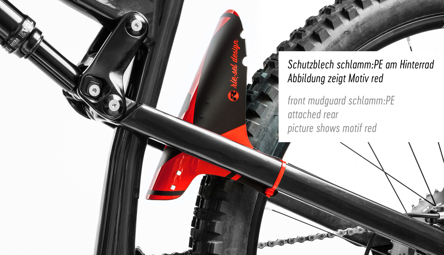 - Verwendungsbereiche – der riesel design „schlammPE“ Mudguard wurde für den Spritzschutz im Frontbereich entwickelt. Bei einer Vielzahl von Fahrradmodellen besteht die Möglichkeit den „schlammPE“ auch als Dämpferspritzschutz zu nutzen